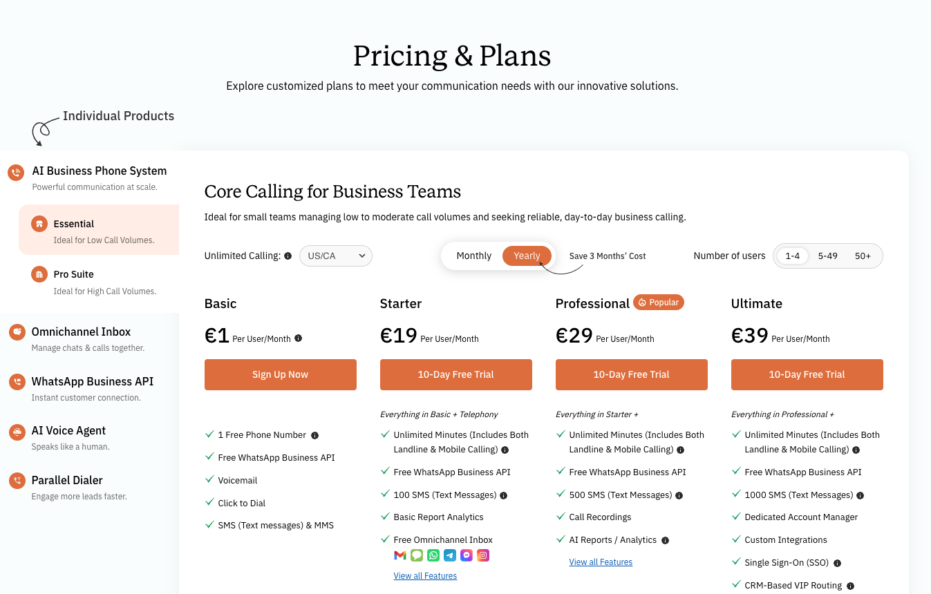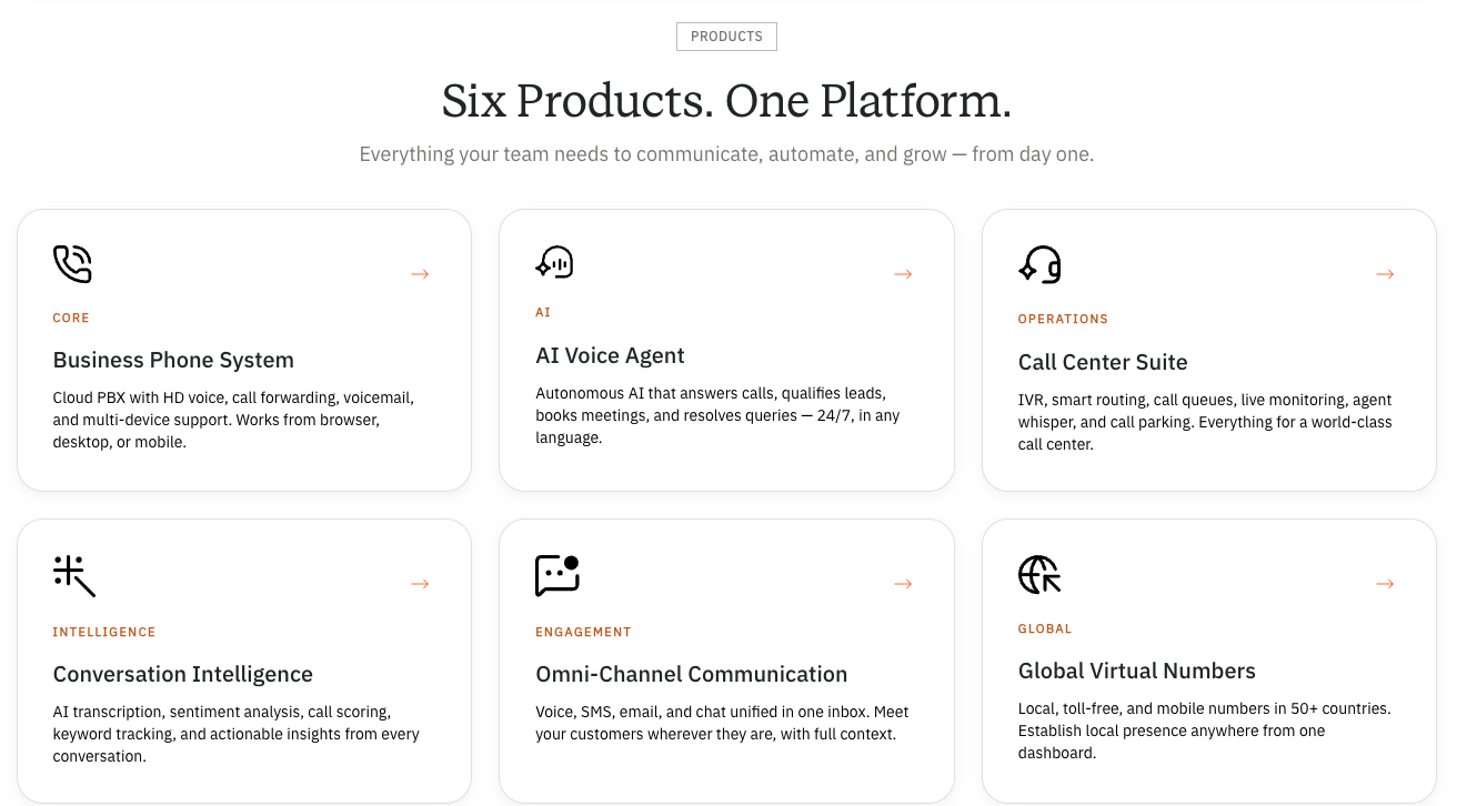 Business Phone System: A complete cloud-based PBX providing HD voice, virtual local/toll-free numbers in 50+ countries, and multi-device support.