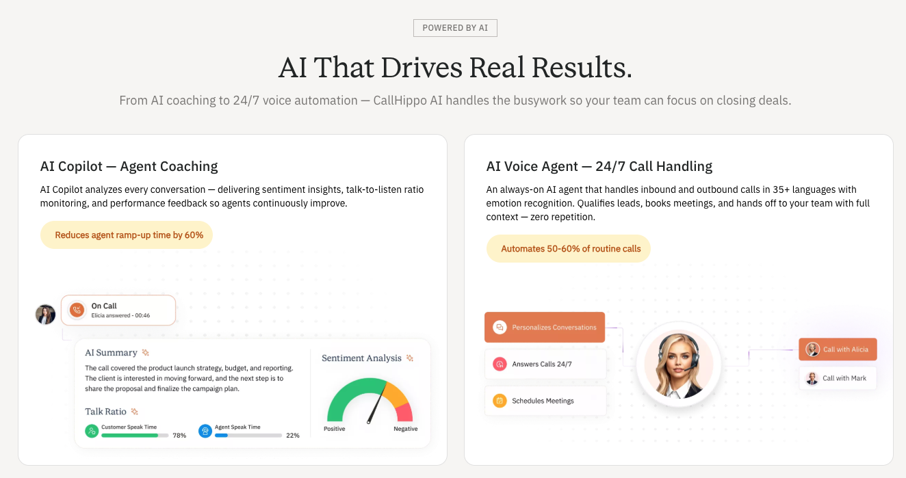 AI Copilot & Coaching: Real-time conversation intelligence that analyzes sentiment, tracks talk-to-listen ratios, and provides instant feedback to agents.